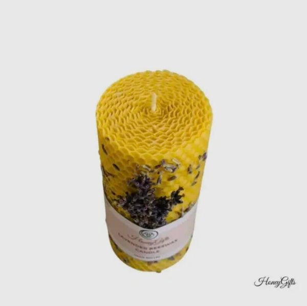 Handgjorda blockljus av 100% naturligt bivax och lavendelblommor samt eterisk bergslavendelolja. Höjd 13 cm, bredd 4 cm.